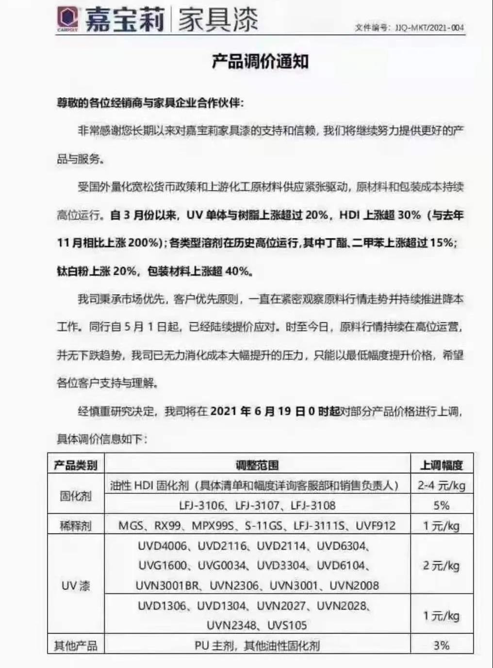 6月19日起,嘉宝莉则表示家具漆将价格上调,固化剂上调5%,稀释剂上调1元/kg,UV漆上调1-2元/kg,PU主漆及其它油性固化剂上调3%。