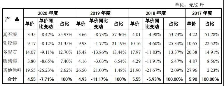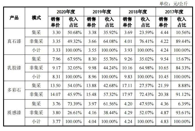 固克节能在答复函中表示,2017-2020年,公司建筑涂料非集采销售单价分别为5.90元/公斤、5.55元/公斤、4.93元/公斤和4.55 元/公斤,呈下降趋势。公司建筑涂料各年的产品结构(各产品销售收入占比)基本保持稳定,建筑涂料非集采销售价格下降主要是行业竞争和市场环境的影响所致: