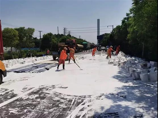 现场评估后,公路部门进行初步处置,使用石粉垫路临时通行,并在现场开展雾炮除尘,11点30分,该路段已恢复双向通行。公路部门也在现场设置了爆闪灯、警示桩、现场告知牌以及夜间照明等安全设施,提醒过往车辆予以配合,并注意安全通行。目前已移交环保部门进行专业处置。