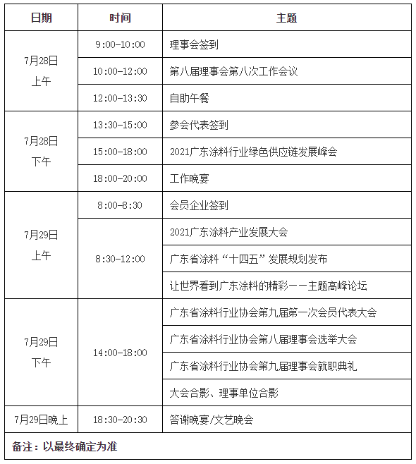 为推动广东省涂料行业健康发展,同时为广东省涂料行业“十四五”开局指明方向。广东省涂料行业协会计划于7月28日-7月29日在广东江门鹤山福朋喜来登酒店举行广东省涂料行业协会换届选举大会、第九届第一次会员代表大会暨2021广东涂料产业发展大会。