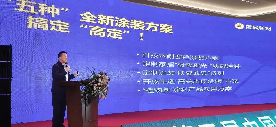 纵观家居行业的发展历程,每一次家居行业的巨大飞跃都与新材料和工艺技术的运用密不可分。李峰就当前定制家居行业对新型涂装的要求,为与会人员带来了关于环保、涂装、色彩的新思路和新见解,介绍了展辰新材的科技木耐变色涂装、定制家居“极致哑光”质感涂装、定制家居“肤感效果”涂装、开放半透高端木皮涂装、植物基涂装等方案。同时,从产品体系、应用经验、服务团队等方面解读了展辰新材的家具环保涂装一揽子解决方案。