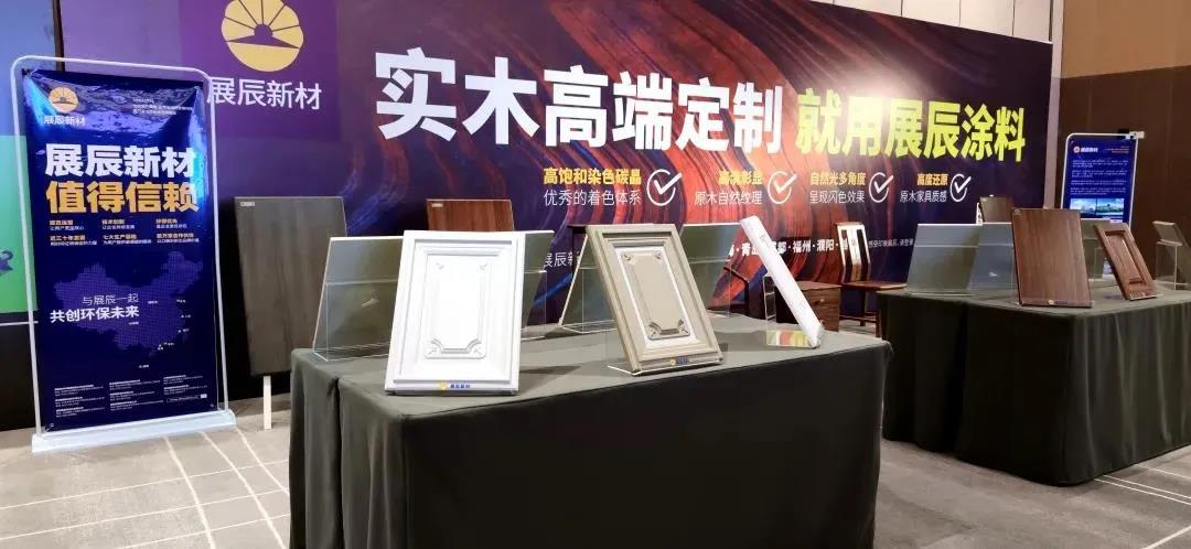 大会期间,展辰新材在大会现场同步展示了全新的实木4.0系列产品——“晶透、晶润、晶彩三大系列”,该系列产品适用于以“新中式、极简、轻奢”为特点的实木家具,“薄、透、闪、挺、柔”的产品特性能完全满足高端实木家具的涂装需求。制作精美的涂装样板,吸引不少嘉宾驻足咨询。