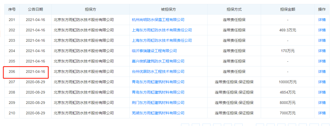 5月12日,东方雨虹发布一篇《北京东方雨虹防水技术股份有限公司关于为下属公司提供担保的进展公告》。深挖下去,这只是冰山一角。据天眼查显示,单单2021年,截至4月16日,东方雨虹已经为206家公司提供担保,其中为136家提供担保金额,占比66%;担保金额88.4万元至4亿元不等。