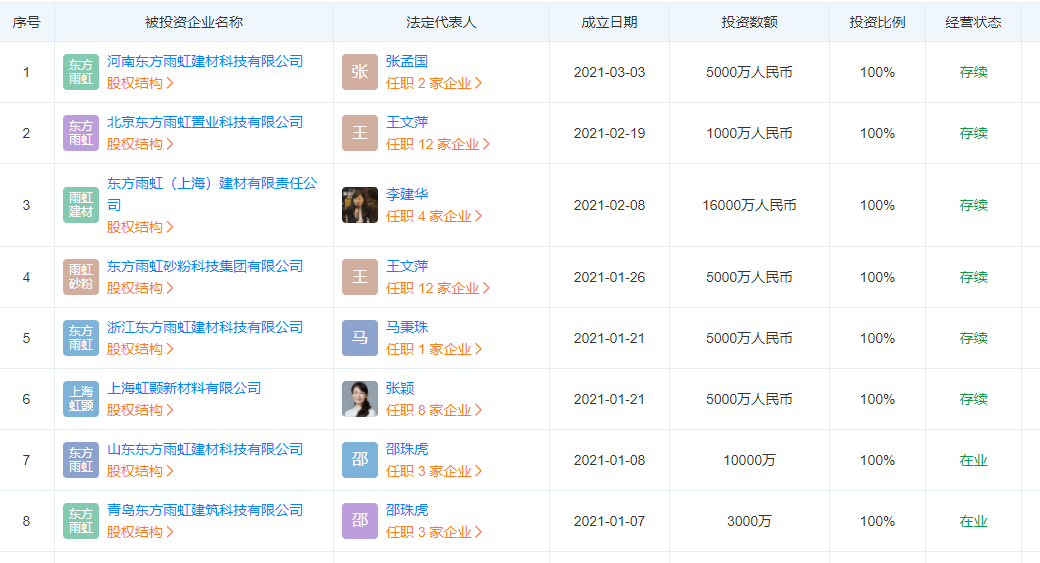 据天眼查显示:截至2021年3月3日,2021年东方雨虹旗下新成立的公司有8家,新设立的公司可以说是与东方雨虹的投建基地密切相关。若算上德爱威、华砂置业、卧牛山等旗下新成立的子公司,截至目前共有50多家。