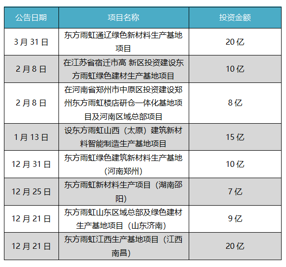 步入2021年,东方雨虹的投资步伐并没有放缓。在截至今日。东方雨虹先后投资江西生产基地项目、山东区域总部及绿色建材生产基地项目、湖南邵阳新材料生产项目、河南郑州绿色建筑新材料生产基地、山西太原建筑新材料智能制造生产基地项目、河南省郑州市中原区投资建设郑州东方雨虹楼店研仓一体化基地项目及河南区域总部项目、江苏省宿迁市高 新区投资建设东方雨虹绿色建材生产基地项目、通辽绿色新材料生产基地项目8个基地项目,斥资近100亿。