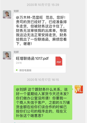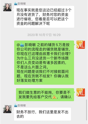 2020年10月13日,打完款后(金额为150344.16元)向冠军涂料进行了第二次下单,却被告知不能给发货,必须要结清此前的5万元铺货款,冠军涂料给出的理由是超过3个月没有进货,财务审核通不过。