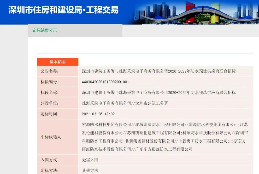 如果说获上榜预选供应商实属偶然,那么获得多家企业或者国家的认可,那么必定是其有何闪光点异于他人,据了解,在此之前,东方雨虹、德生、禹红、大明、宏源中标了深圳市建筑工务署2018-2022年防水预选供应商。