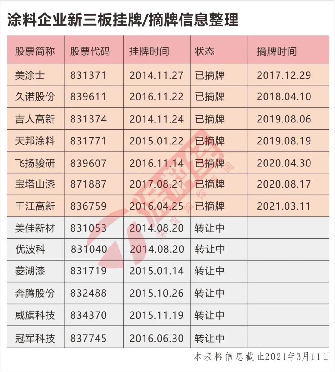 此外,正如上文所提到的,上市是为了获取资金从而扩大优势,那么涂料企业挂牌新三板的意义也就值得商榷。根据《涂料经》的监测,目前还有6家新三板挂牌涂料企业,但它们挂牌多年,除了美佳新材之外,其它企业的成长性并不大,甚至有倒退的企业。资本不是谁都玩得转的,更不用说新三板的活跃性始终是一个被外界诟病的短板。