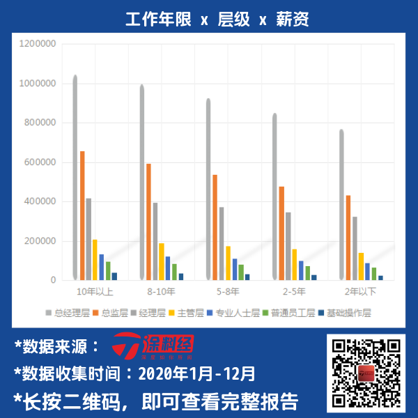 通过柱状图我们可以清晰的看到,当从业人员所处的层级越低时,学历对于薪酬的影响力是相对较弱的。