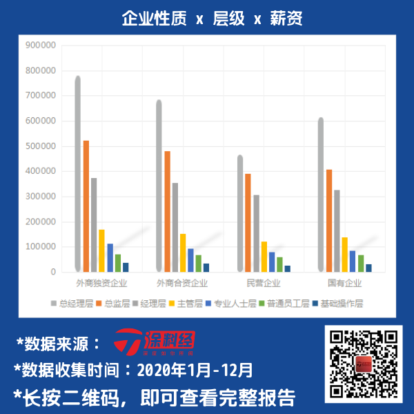 各个层级中的年度总现金,外资独资企业>外资合资企业>国有企业>民营企业,而且随着层级的上迁,企业性质对于薪酬的影响力是成正比的。