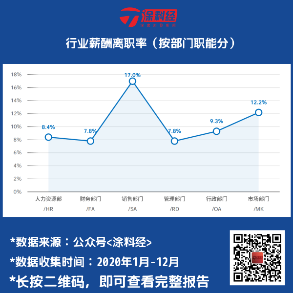 在行业薪酬离职率中,若按部门职能分类,销售部门也是最高的,达17%;而管理部门最低,不过也高达7.8%。