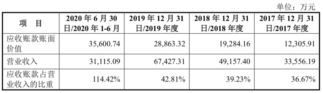 2017年至2019年,固克节能应收账款账面价值分别为1.23亿元、1.93亿元、2.89亿元,应收账款占营业收入的比重逐年增加,分别为36.67%、39.23%、42.81%。而截至2020年6月末,该公司应收账款账面价值大幅上升至3.56亿元,占当期营收比例高达114.42%,较2019年末增加超过70个百分点,明显高出同行业可比公司水平。