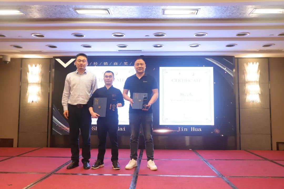 中国建筑装饰装修材料协会建筑涂料分会秘书长朱厚举(左)为瓦帕茵特优秀经销商颁奖