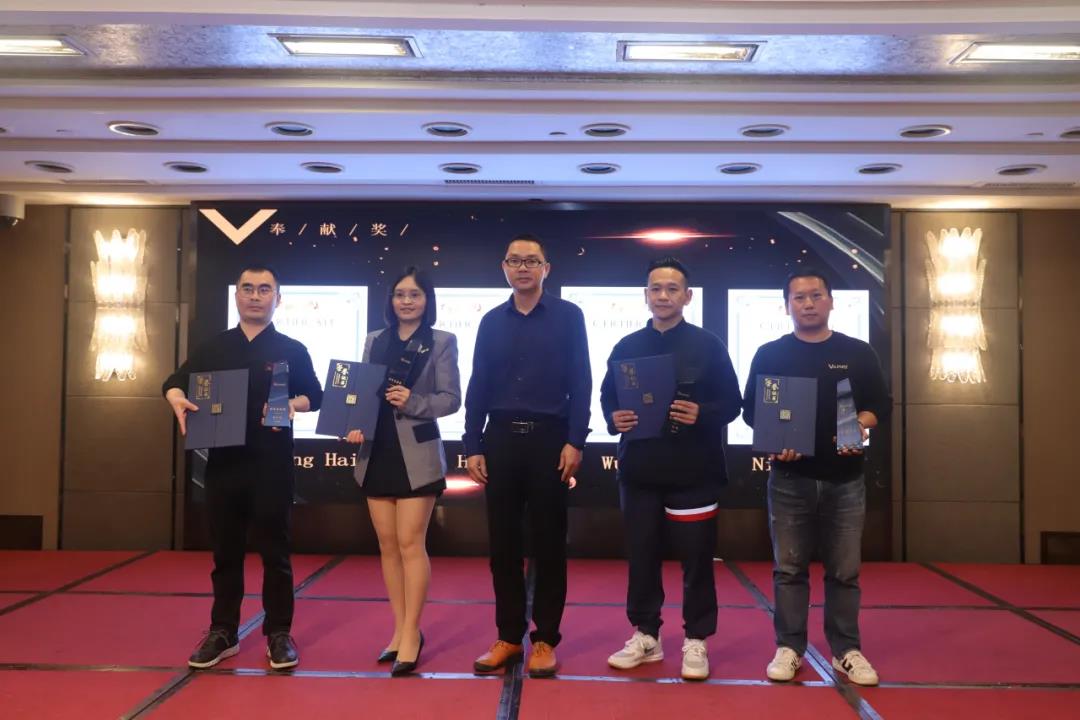 广东省涂料行业协会秘书长吕水列(中)为瓦帕茵特奉献奖获得者颁奖