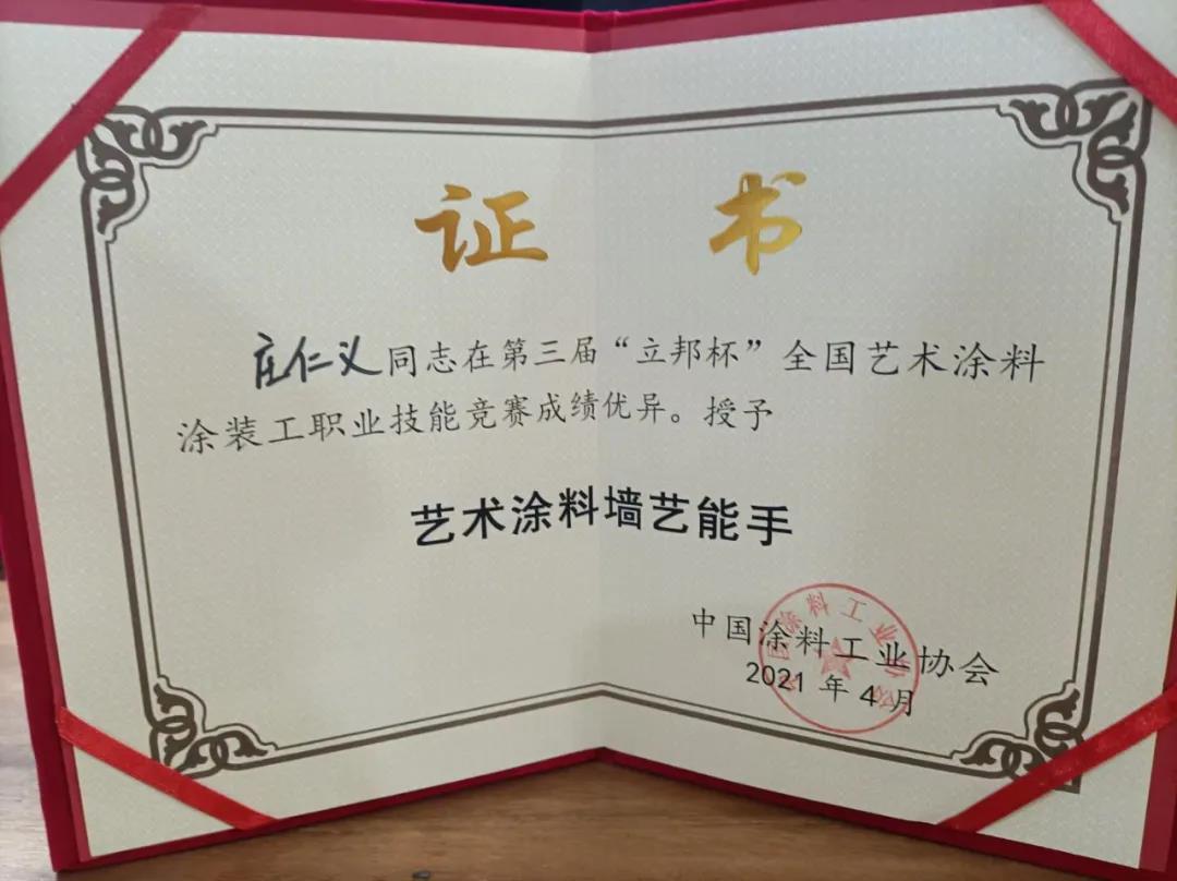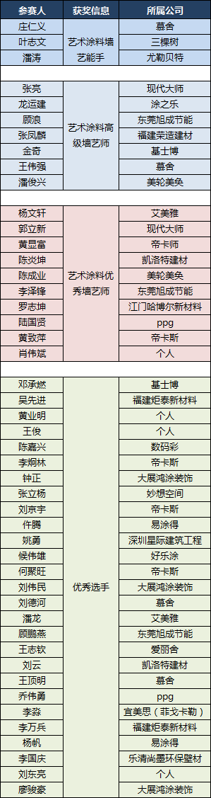 4月13日,为期三天的第三届“立邦杯”全国艺术涂料涂装工职业技能竞赛暨第十四届全国石油和化工行业职业技能预赛圆满落下帷幕。此次大赛的主题是“现代简约生活”,有27名参赛选手获得“优秀选手”称号;10名选手获得“艺术涂料优秀墙艺师”称号;7名选手获得“艺术涂料高级墙艺师”称号;3名选手——来自慕舍的庄仁义、三棵树的叶志文、尤勒贝特的潘涛——分别包揽冠、亚、季军,获得“艺术涂料墙艺能手”称号。