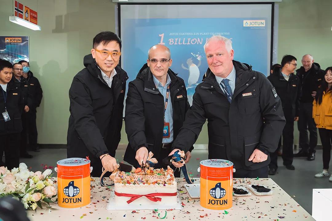 佐敦东北亚区副总裁、佐敦涂料(张家港)有限公司总经理Ferran Bueno(中)、副总经理汤国牛ㄗ螅┮约岸北亚区技术总监、佐敦涂料张家港工厂运营总监Mark Chapman(右)为张家港工厂涂料生产突破1,000,000,000升切纪念蛋糕