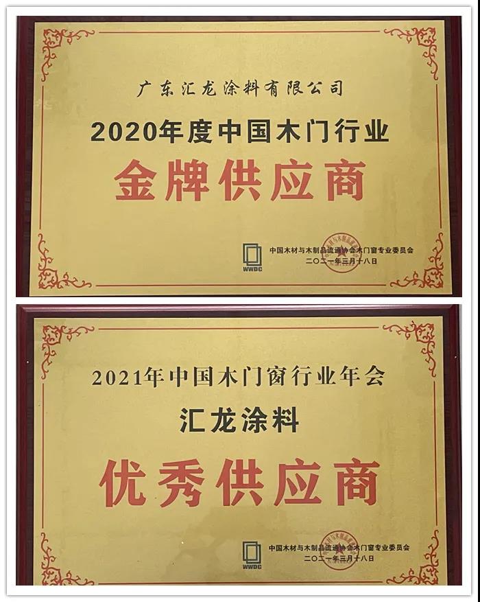 “2020年度中国木门行业金牌供应商”、“2021年中国木门窗行业年会优秀供应商”,这是汇龙涂料在2021年全国木门双承诺品牌影响力大会暨中国木门窗行业年会上所获得的双重大奖,对汇龙涂料多年来专注于环保家具、木门涂装的肯定。