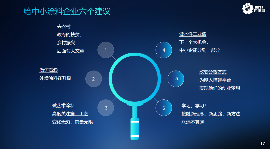 对此,施青林给中小涂料企业提出了六个建议,将本次演讲推向高潮: