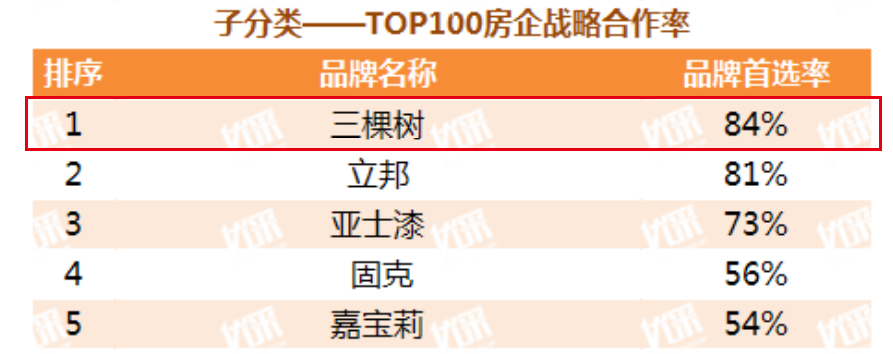 根据数据显示,自三棵树工程成立以来,已与万科、恒大、中海、保利、融创等84家百强地产开发商达成战略合作,连续10年获评恒大地产集团优秀供应商,多次获评中海地产优秀合作商、融创中国材料类优秀供应商、龙湖集团优秀供应商、富力集团优秀合作供应商、绿地控股核心供应商等18家百强地产优秀供应商称号。