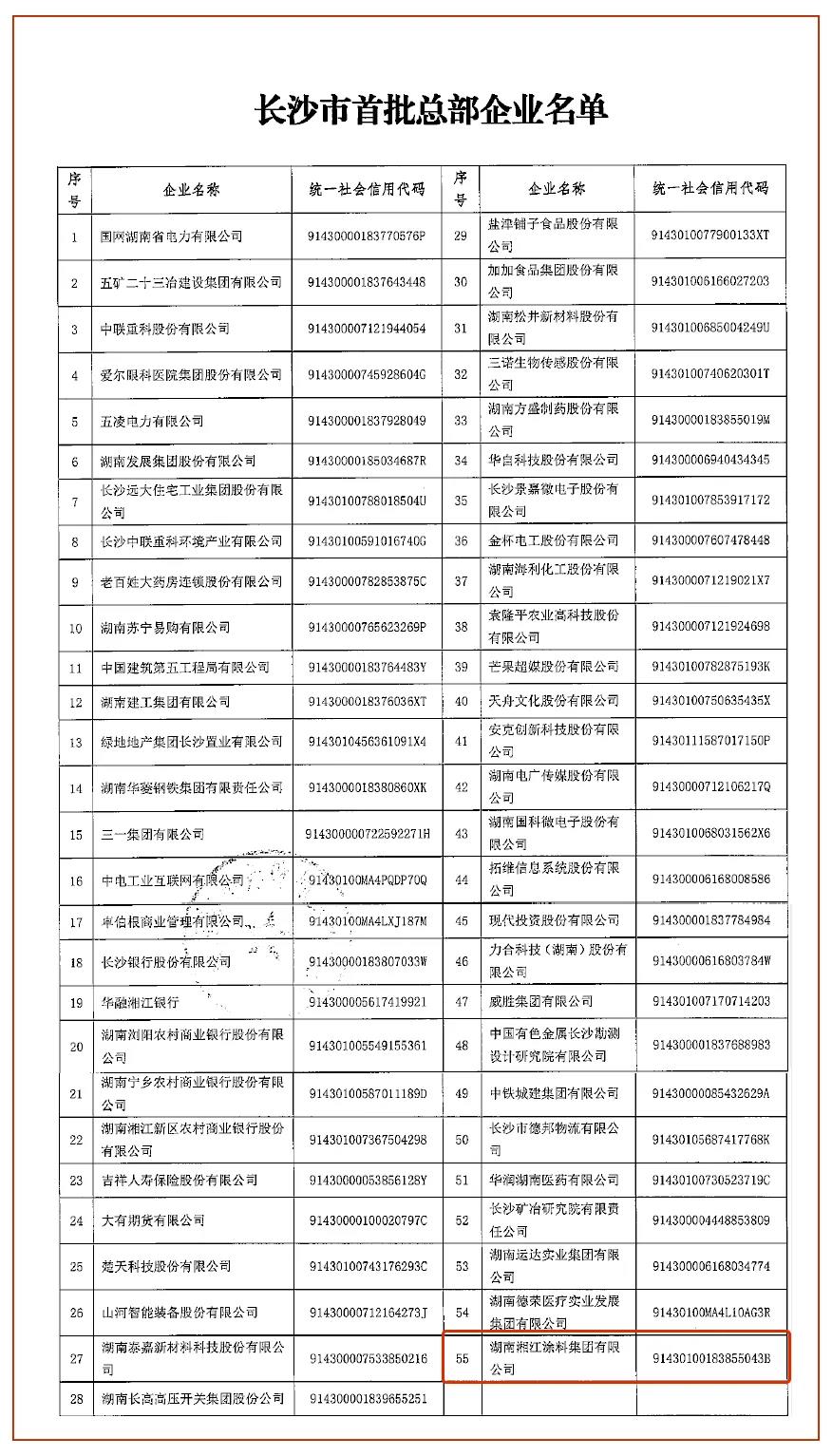 近日,长沙市发展和改革委员会公布了长沙市首批总部企业名单,湖南湘江涂料集团有限公司有幸被评为长沙市首批总部企业之一。