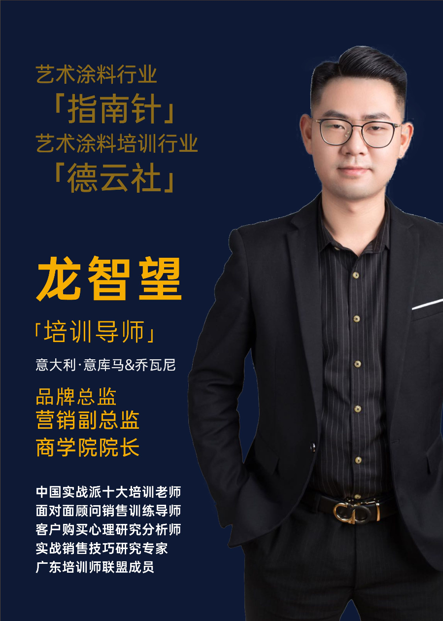 龙智望,意库马事业部及乔瓦尼事业部品牌总监兼营销中心副总监,商学院院长。担任艺术涂料培训导师期间,促使该品牌的销售业绩在全国位居前列;同时,他是中国实战派十大培训老师,面对面顾问销售训练导师,实战销售技巧研究专家,客户购买心理研究分析师,广东培训师联盟成员。