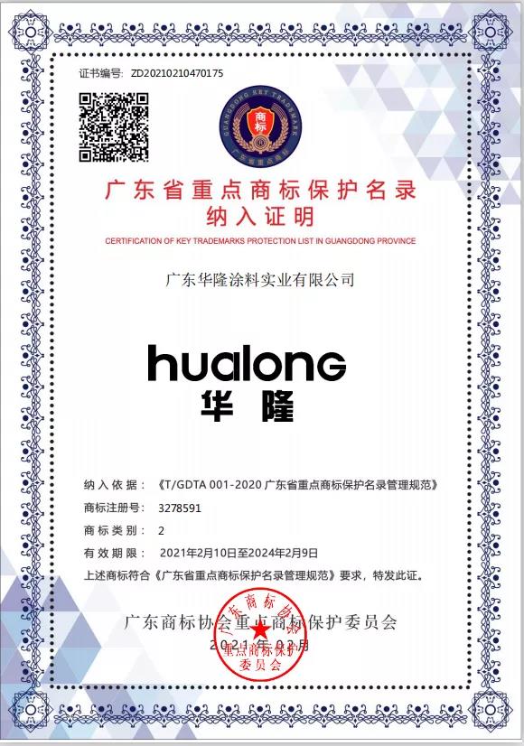 近日,华隆涂料被广东商标协会重点商标保护委员会正式纳入“广东省重点商标保护名录”且获两项大奖,分别是“2020年度钻石客户”奖和“热心公益”奖。