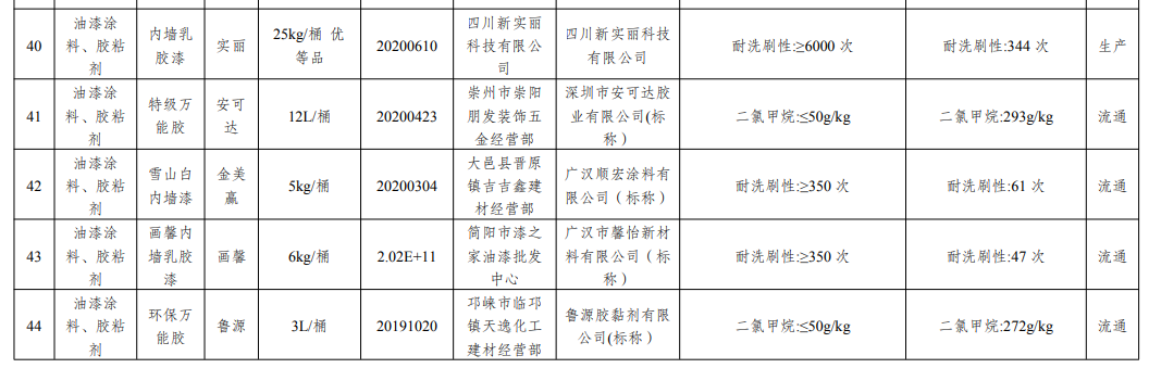 此外,还对所抽胶粘剂产品的挥发性有机化合物含量,苯含量,甲苯、二甲苯含量总和,甲醛,压缩剪切强度等项目进行了检验,检出5批次产品质量不合格,不合格发现率为3.6%。不合格项目为耐洗刷性、二氯甲烷。
