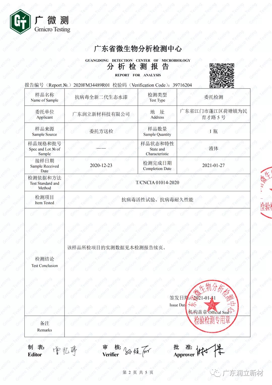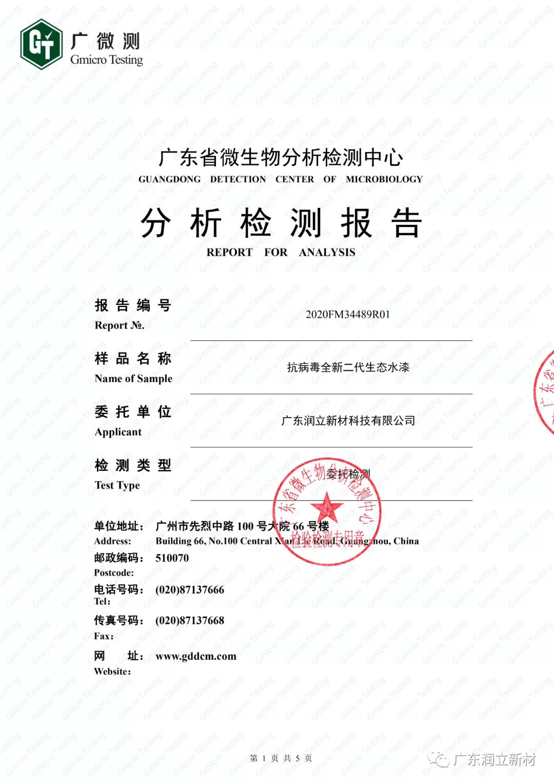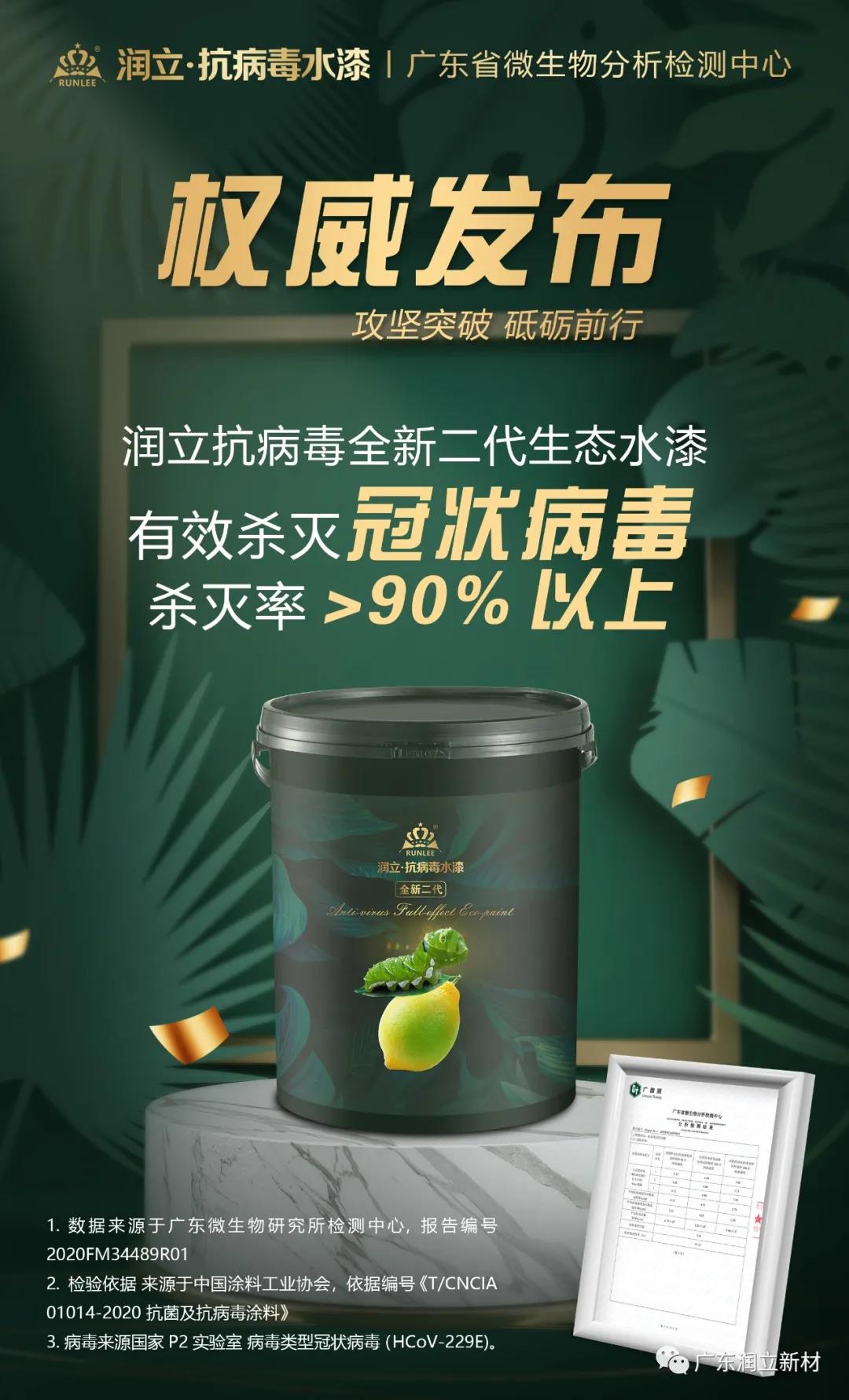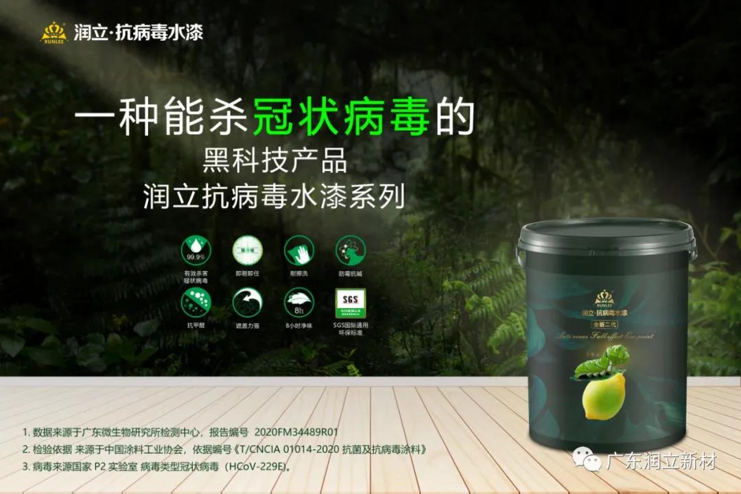 近日,广东润立新材科技有限公司(简称润立新材)通过官方微信公众号表示,其抗病毒涂料产品——润立抗病毒全新二代生态水漆——通过国家权威机构广东省微生物分析检测中心(简称广微测)关于抵抗冠状病毒技术检测,成为率先通过这一检测的国内抗病毒涂料产品之一。
