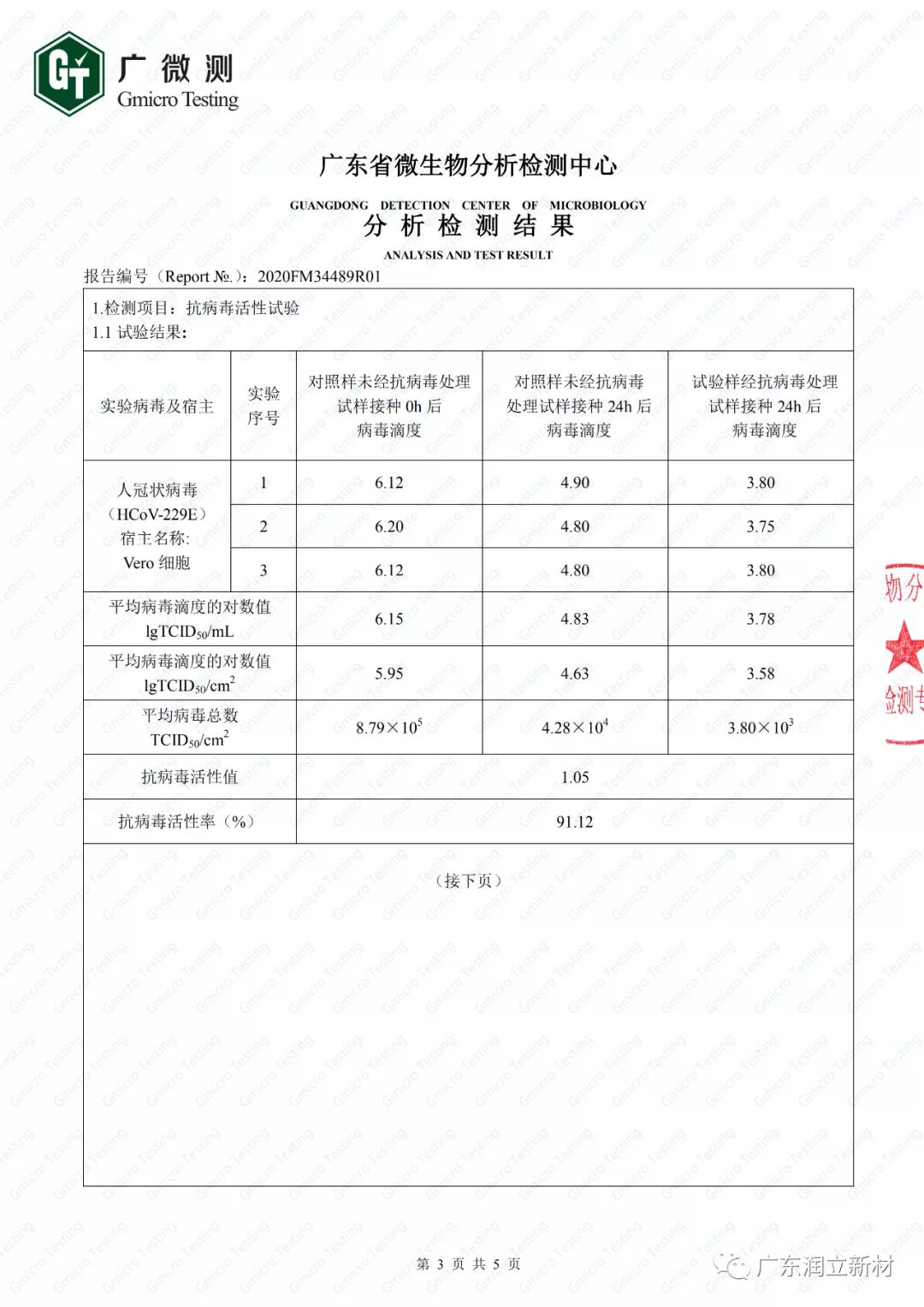 根据润立新材展示的检测报告,此次抗病毒活性试验的实验病毒为人冠状病毒HCoV-229E,宿主为Vero细胞,并对其产品的抗病毒活性和抗病毒耐久性两个项目进行实验。实验结果显示:经抗病毒处理的润立抗病毒全新二代生态水漆,能“有效杀灭冠状病毒>90%,杀灭冠状病毒效果显著”;通过紫外灯模拟涂膜自然老化,抗病毒水漆“灭杀冠状病毒能力在10年以上仍然保持功效”。(附检测结果图)