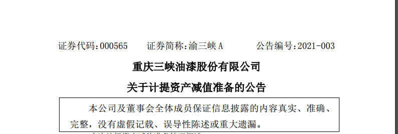 近日,重庆三峡油漆股份有限公司(证券代码:000565;证券简称:渝三峡A)发布关于计提资产减值准备的公告,表示为真实、准确地反映公司截止2020年12月31日的财务状况及经营情况,基于谨慎性原则,根据《企业会计准则》及公司有关会计政策等相关规定,公司对合并报表中截止2020年12月31日相关资产价值出现的减值迹象进行了全面清查和分析,进行了减值测试,并依据测试结果计提相应的资产减值准备。