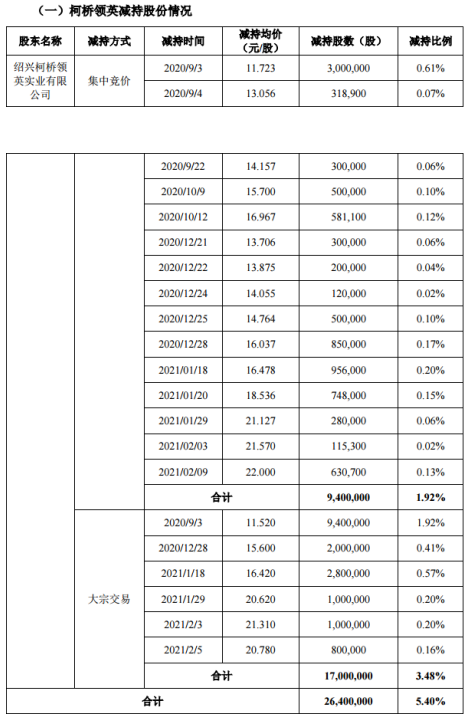 柯桥领英是在2020年8月开启清仓式减持计划的,当时它持有金力泰股份4703.4万股,占公司总股本的10.00%,拟在减持期(6个月)内全部转让。截止2021年2月9日,柯桥领英通过集中竞价、大宗交易方式总共进行了21次股票减持计划,减持股数合计2640万股,减持比例达5.40%。其中,通过集中竞价方式减持的股数合计940万股,减持比例达1.92%;通过大宗交易方式减持的股数合计1700万股,减持比例达3.48%。