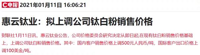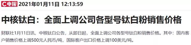 值得注意的是,此次涨价是中核钛白2020年下半年至今第七次上调产品价格。此前,公司分别在2020年7月14日、8月7日、9月8日、10月10日、10月29日、12月3日上调了主营产品钛白粉的价格。