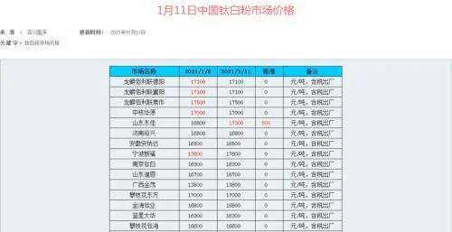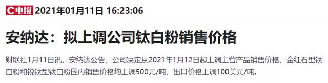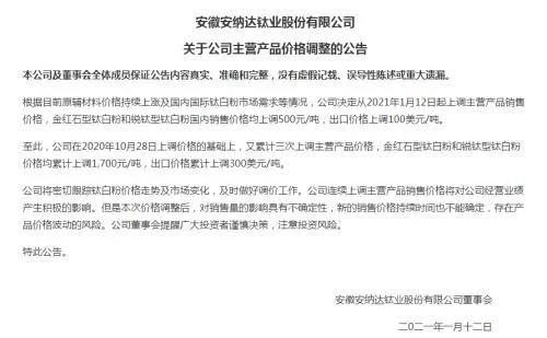 此外,安纳达1月11日晚也发布了公告称,根据目前原辅材料价格持续上涨及国内国际钛白粉市场需求等情况,公司决定从2021年1月12日起上调主营产品销售价格,金红石型钛白粉和锐钛型钛白粉国内销售价格均上调500元/吨,出口价格上调100美元/吨。至此,公司在2020年10月28日上调价格的基础上,又累计三次上调主营产品价格,金红石型钛白粉和锐钛型钛白粉价格均累计上调1700元/吨,出口价格累计上调300美元/吨。