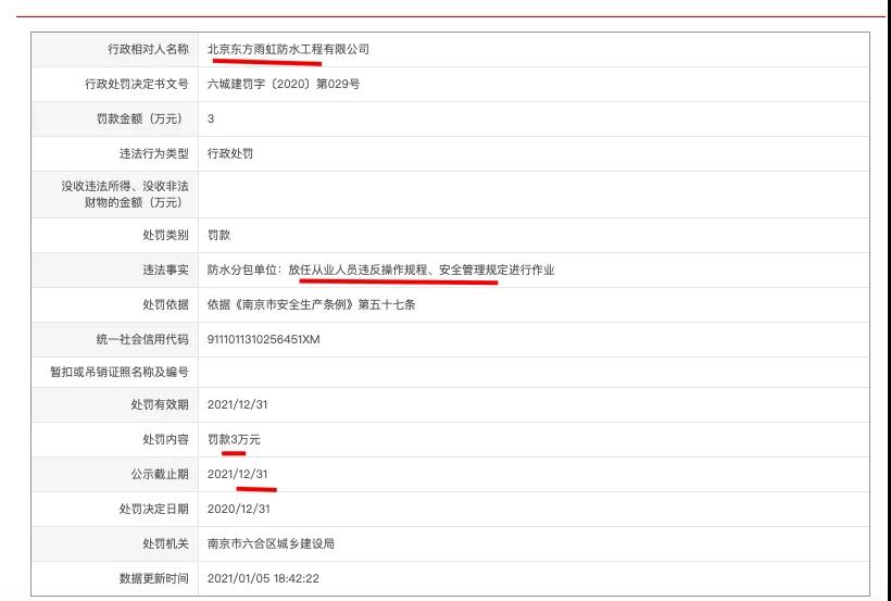 据南京人民政府网南京市行政许可和行政处罚等信用信息公示专栏发布的行政处罚决定书文“六城建罚字〔2020〕第029号”显示,北京东方雨虹防水工程有限公司因防水分包单位放任从业人员违反操作规程、安全管理规定进行作业的违法事实被罚3万元,处罚决定日前显示为2020年12月31日。