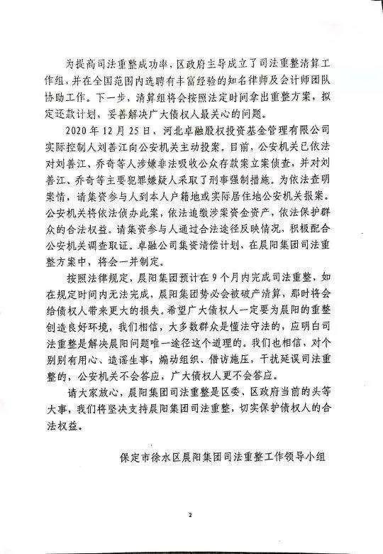 徐水区政府也很快跟进,于12月27日发布《关于晨阳集团处置工作有关进展情况的通报》,表示“经反复论证,并深入研究外地成功经验,徐水区委、区政府决定,同意并支持晨阳集团进行重整”。