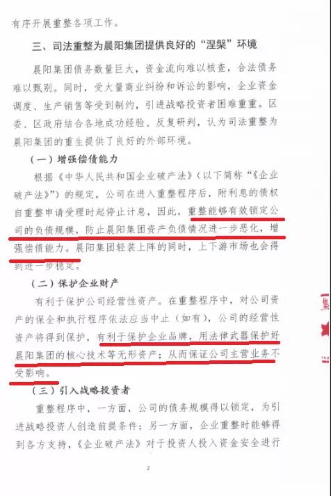 同时,受大量商业纠纷和诉讼的影响,企业资金调度、生产销售等受到制约,引进战略投资者困难重重。从现在的结果来看,晨阳集团的自救明显已失败。所以经反复论证,并深入研究外地成功经验,最终当地政府决定∶同意并支持晨阳集团进行司法重整。