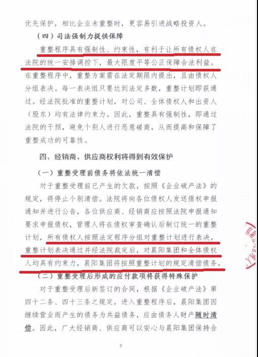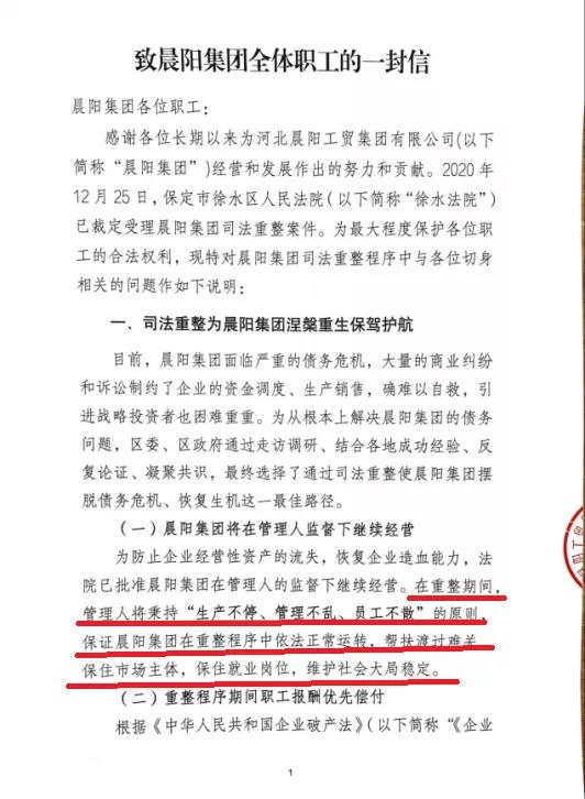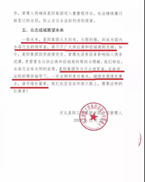 在确定司法重整的方案之后,晨阳集团积极行动,12月27日、28日,河北晨阳工贸集团有限公司管理人连续发布了两份公开信,包括保护经销商、供应商知情权以及保护长期以来所建立的合作关系的《致晨阳集团经销商、供应商的一封信》与保护职工合法权利的《致晨阳集团全体职工的一封信》。
