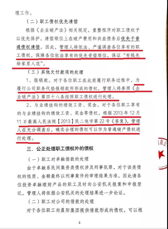 针对集团全体职工方面,晨阳集团将在管理人监督下继续经营,秉承“生产不停、管理不乱、员工不散”依法正常运转,此外在重整程序期间职工的报酬有限偿付。进入重整程序后,各位职工无须就晨阳集团此前所欠付的职工债权向管理人申报,将于2021年1月15日后正式着手展开职工债权的调查及清理工作。