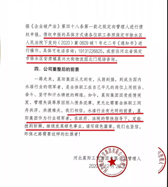 “一路走来,晨阳集团从无到有,从弱到强,到成为国内外水漆行业的领军者,是全体职工在自己平凡的岗位上用担当、奋斗、坚守和汗水铸就的辉煌。如今,晨阳集团因受疫情突发、管理失误等原因陷入债务泥潭,更无比需要全体职工同舟共济、共渡难关。我们相信,水漆行业有光明的前景,晨阳集团作为行业领军者,在政府、法院的帮扶指导下,定能披荆斩棘,继续发展绿色事业,谱写绿色篇章。我们也坚信,环保之路需要这样的的扛旗者!”