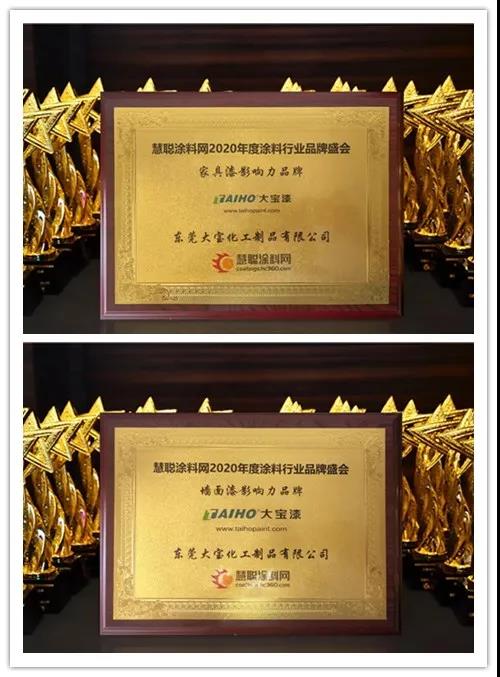 2020中国涂料品牌盛会,大宝漆再创品牌影响力佳绩,荣获“家具漆影响力品牌”和“墙面漆影响力民族品牌”两项大奖。