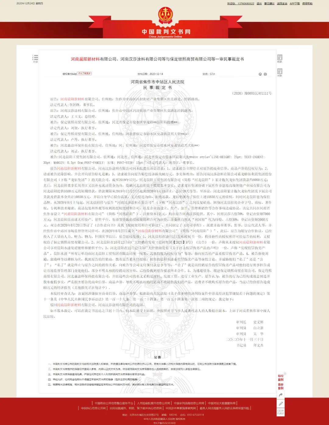 2020年12月14日,中国裁判文书网发布了《河南晨阳新材料有限公司、河南汉莎涂料有限公司等与保定锁熙商贸有限公司等一审民事裁定书》(以下简称《裁定书》)。尽管《裁定书》驳回了原告河南晨阳新材料有限公司(下称河南晨阳)、河南汉莎涂料有限公司(下称河南汉莎)对包括河北晨阳工贸集团有限公司(下称河北晨阳)在内的4名被告的起诉,却让这一起涂料行业“罗生门”事件呈现出更加清晰的脉络。