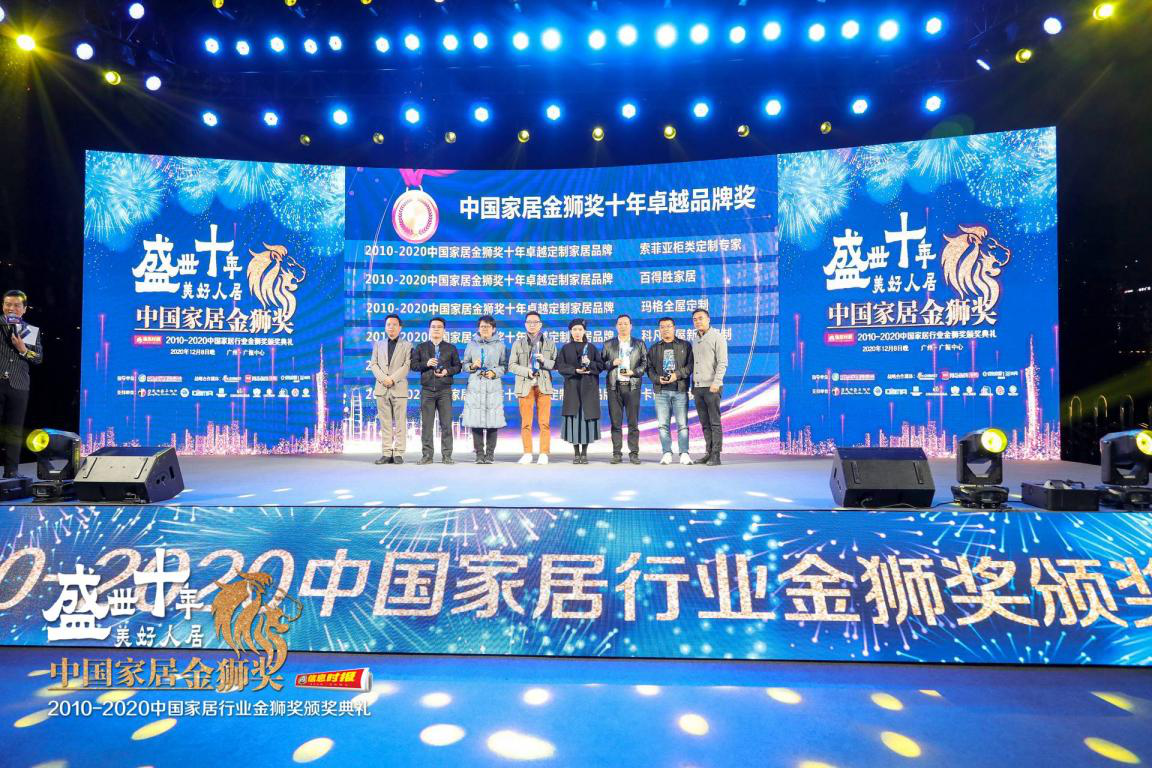 2010-2020中国家居金狮奖十年卓越定制家居品牌 索菲亚柜类定制专家、百得胜家居、玛格全屋定制、科凡全屋新奢定制、伊仕利家居、卡诺亚定制家居