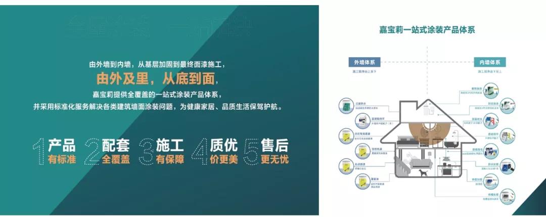 此外,嘉宝莉聚焦新生代消费需求,用创新方式将涂料产品与设计、产品与服务完美融合,提出了2020年全新战略,全屋一站式涂装解决方案。由外及里,从底到面,产品全覆盖,标准化服务体系解决家庭涂装问题。