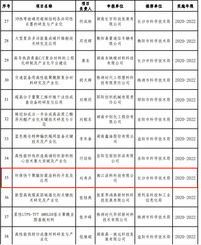 近日,湖南省科学技术厅公示了2020年度湖南省高新技术产业科技创新引领计划立项项目名单。湘江涂料科技有限公司(简称湘江科技)的“环保快干聚脲防腐涂料的开发及应用”项目成功入选。