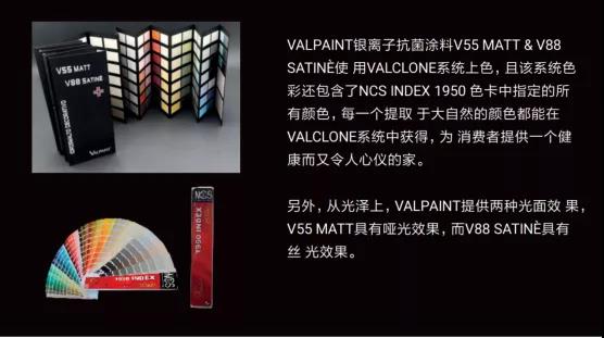 本次新发布的VALPAINT银离子抗菌涂料两款产品包括:V55 MATT具有哑光外观,V88 SATINE具有丝光效果,涂层细腻,手感爽滑,可以满足中国市场的主流消费需求。