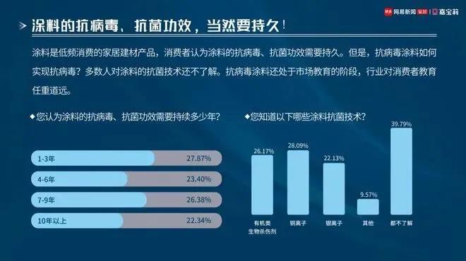 “对于抗病毒涂料这个'新物种',消费者的认知还不是很深刻。在参与调查的受访者中,21.28%的消费者认为'有抗病毒涂料,真是太好了',但有43.83%的消费者对抗病毒涂料半信半疑。”嘉宝莉在解读《白皮书》的调研结果时如是表示。