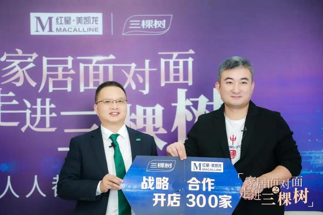 三棵树集团董事兼副总裁朱奇峰(左)与红星美凯龙家居集团执行总裁朱家桂启动开店300家战略合作