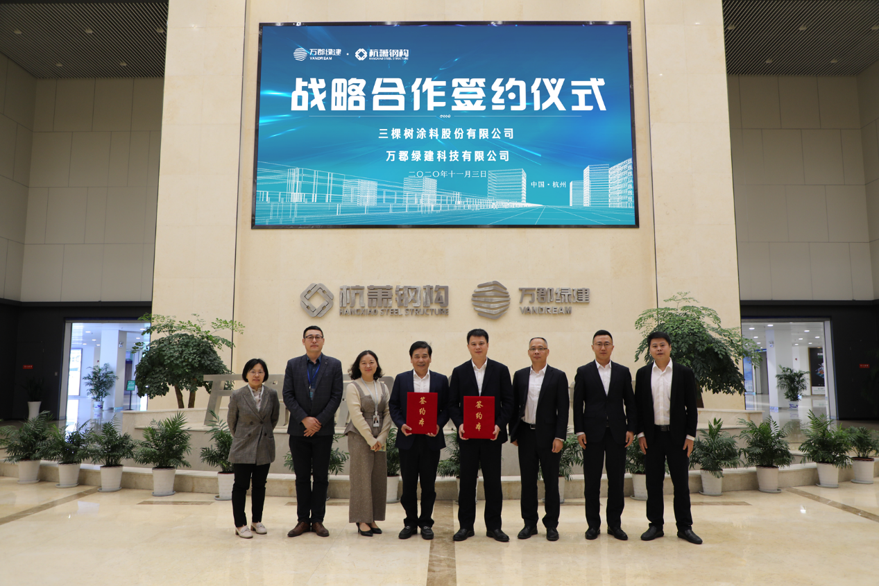 11月3日,三棵树工业涂料与杭萧钢构集团万郡绿建平台签订“工业涂料”品类战略合作,并在杭州万郡绿建智慧展示中心正式签署战略合作协议。