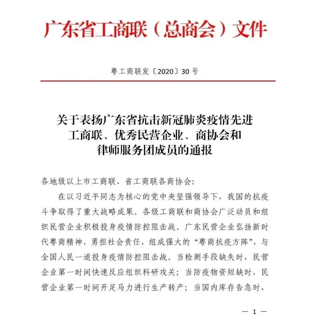 广东省工商联(总商会)发布了《关于表扬广东省抗击新冠肺炎疫情先进工商联、优秀民营企业、商协会和律师服务团成员的通报》,其中美涂士被评为“广东省抗击新冠肺炎疫情重要贡献民营企业”。