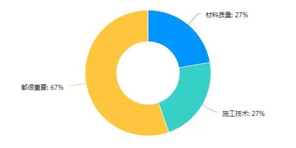 测评数据显示,67%消费者认为都很重要,质量质量和施工技术均占27%。业内专家表示,厨卫间出现渗漏水的原因主要有两个,或是质量不合格,或是没有按照标准施工,业内也有“3分材料、7分施工”的说法。
